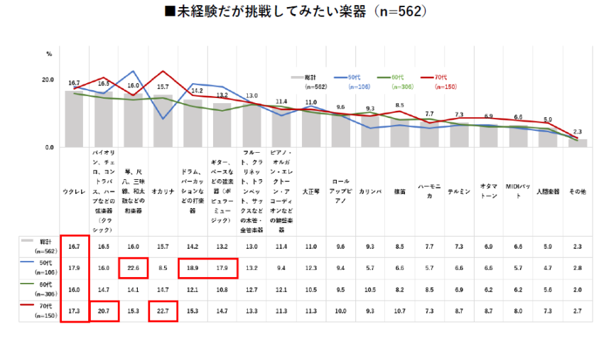 50代から高い支持を集めたのは「琴、尺八、三味線、和太鼓などの和楽器」「ドラム、パーカッションなどの打楽器」「ギター、ベースなどの弦楽器」。また、70代は「バイオリン、チェロ、コントラバス、ハープなどの弦楽器」「オカリナ」の人気が特に高く、両方20%を超えています。