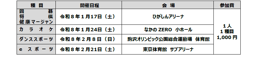 ■開催日程:【囲碁・将棋・健康マージャン】2026年1月17日【カラオケ】2026年1月24日【ダンススポーツ】2026年2月8日【eスポーツ】2026年2月21日