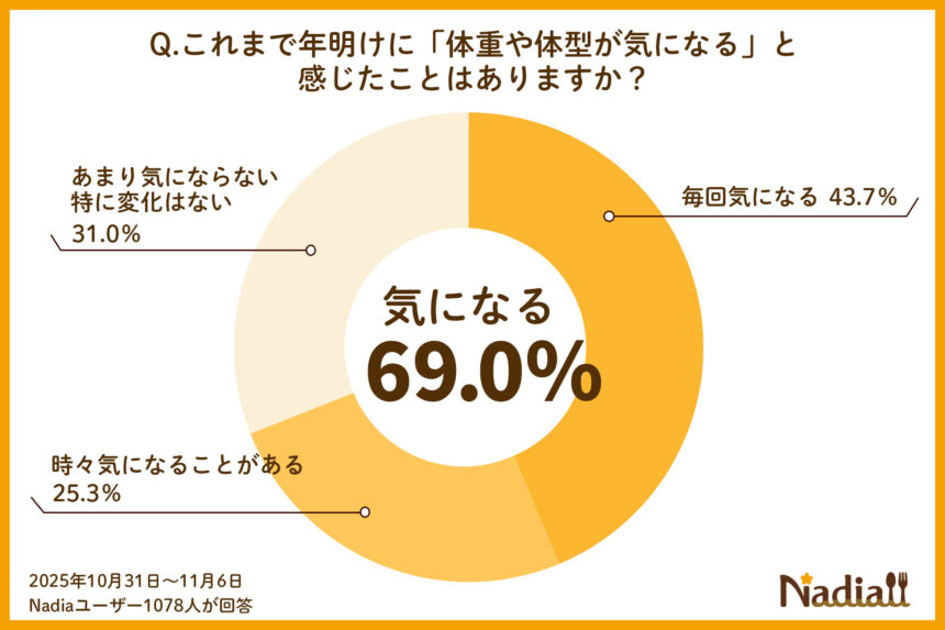これまで年明けに「体重や体型が気になる」と感じたことがあるか尋ねたところ、「気になる」と回答した人は69.0%にのぼりました。多くの人が正月太りを経験していることがわかります。また、正月太りを解消するために行うこととして、最も多かったのは「食事制限・食生活の見直し」(46.4%)で、次いで「運動」(42.1%)という結果になりました。
