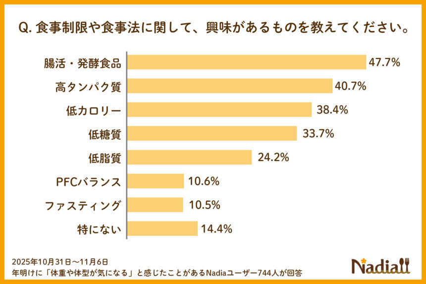 さらに、興味がある食事制限・食事法について聞いたところ、1位は「腸活・発酵食品」、2位は「高タンパク質」でした。Nadiaの検索データでも、2023年1月の「低糖質」検索数を100%とした場合、24年は61.4%、25年には34.1%と減少。最近のトレンドとして、低カロリー・低糖質・低脂質といった「制限系」の食事法よりも、腸活・発酵食品のような「体に良いものを取り入れて整える」「腸内環境や栄養バランスを重視する」ことに関心が集まっていることが見て取れます。