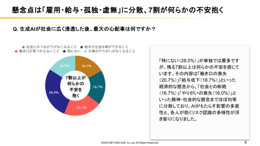 AIが広く浸透した後に心配なことを着てみると、単独では「特にない(28.0%)」が最多ですが、残る7割以上は何らかの不安を感じています。その内容は「働き口の喪失(20.7%)」「給与低下(18.7%)」といった経済的な懸念から、「社会との断絶(16.7%)」「やりがいの喪失(16.0%)」といった精神・社会的な懸念までほぼ均等に分散しており、AIがもたらす影響の多面性と、各人が抱くリスク認識の多様性が浮き彫りになりました。