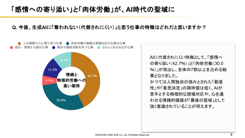 かつては人間独自の強みとされた「創造性」や「意思決定」の期待値は低く、AIが苦手とする物理的な現場対応や、心を通わせる情緒的価値が「最後の聖域」として強く意識されていることが窺えます。