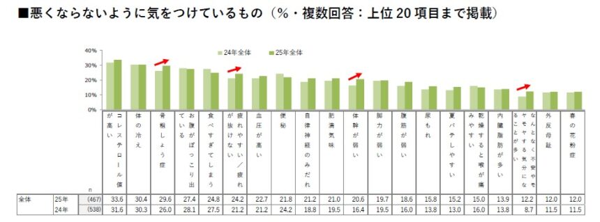 悪くならないように気をつけているものについて聞くと「コレステロール」が最も高く34%、次いで「体の冷え」30%でした。「骨粗しょう症」が2024年から3.6ポイント増加し、5位から3位に上昇しています。