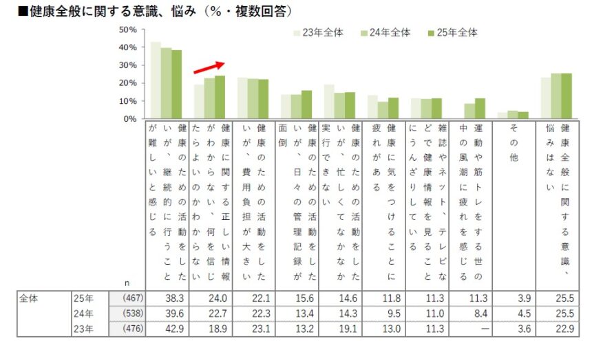 健康全般に関する意識や悩みについて聞くと、「健康のための活動をしたいが、継続的に行うことが難しいと感じる」が38.3%と突出して高い結果となりました。また、「健康に関する正しい情報がわからない、何を信じたらよいのかわからない」は2023年の18.9%から2025年では24.0%と5.1ポイント増加し、3年で増加傾向でした。