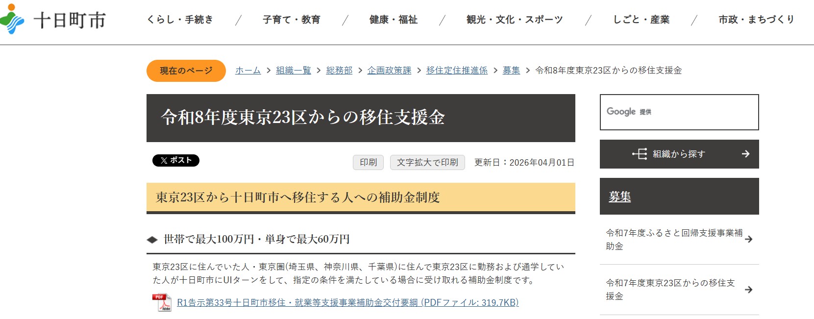 参照:十日町市:令和8年度(2026年)東京23区からの移住支援金