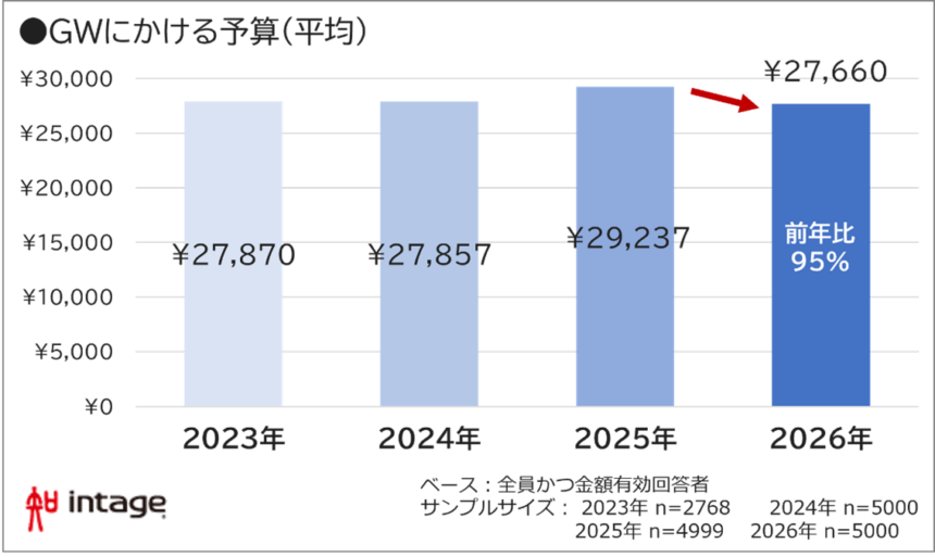 最初に、2026年のGWにかける全体予算を調べたところ平均は27,660円で前年比94.6%と減少しました。コロナ禍を経て外出・旅行需要が回復した2023年以降で一番低い水準です。