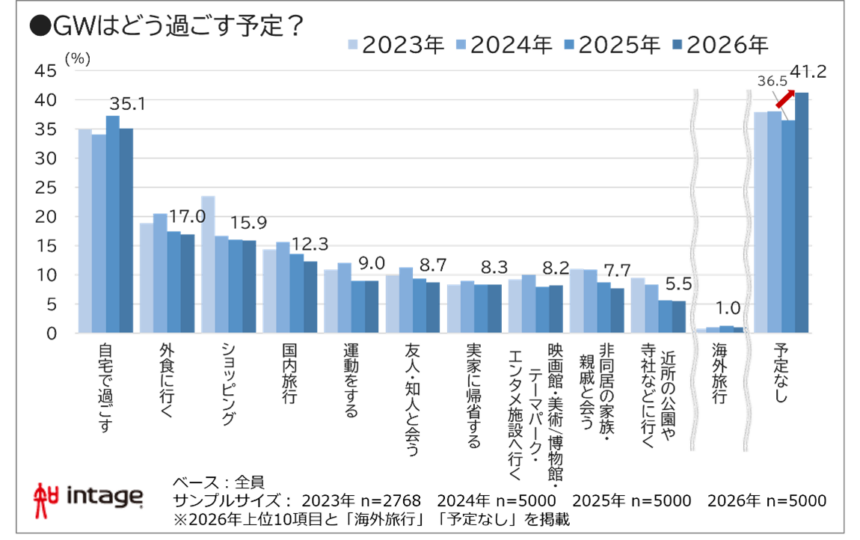 (株)インテージは、3月25日~3月30日に全国の15歳から79歳の男女(5,000人)を対象にGWに関する調査結果を実施しました。2026年のGWの傾向を見てみましょう。
