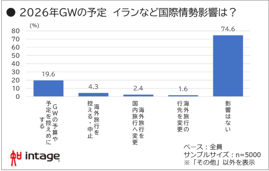 中東情勢、とりわけイランを巡る国際情勢はGWに影響するのでしょうか。複数選択形式で聴取したところ、「特に影響はない」が74.6%を占める一方、「GWの予算や予定を控えめにする」と回答した人は19.6%と無視できない結果になりました。