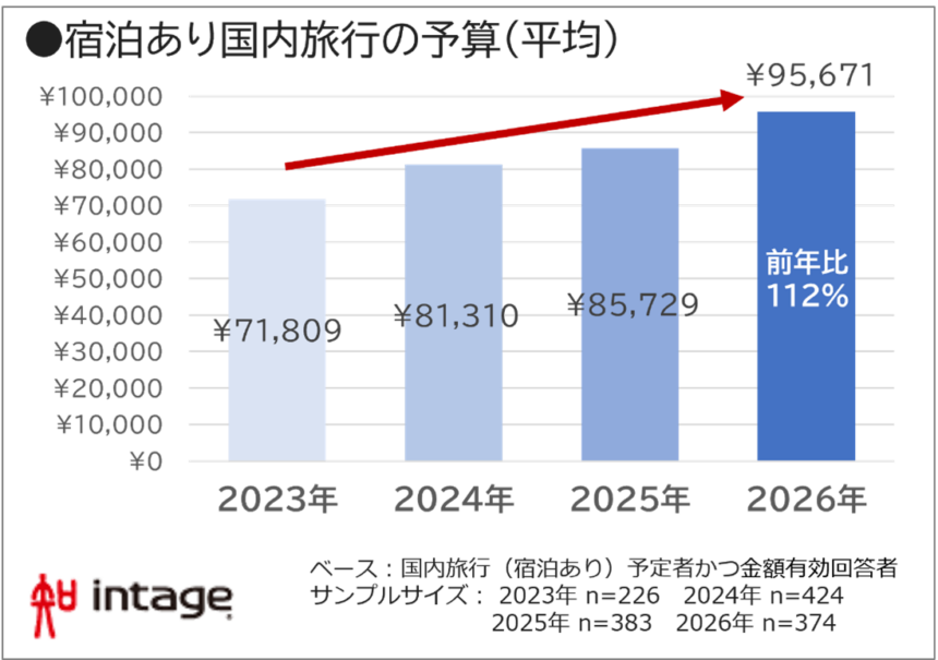 宿泊をともなう国内旅行にかける予算を調べると、平均95,671円と前年から約1.1倍でした。2023年以降、本調査では国内旅行予算は右肩上がりです。