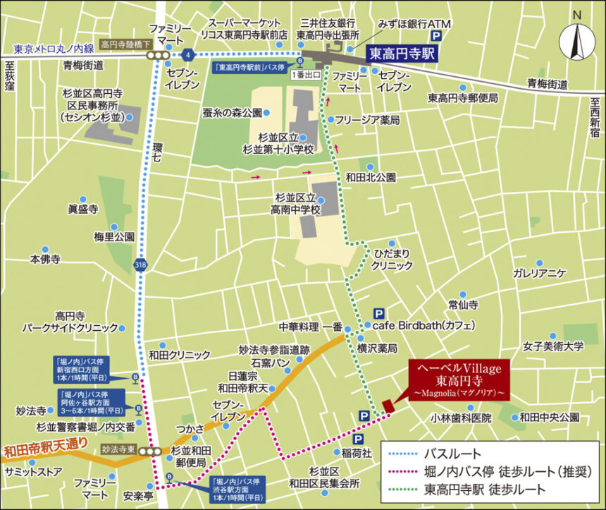 ※掲載の徒歩分数・距離は現地からのものです。 所要時間は1分80mで算出し、小数点以下を切り上げています。 東京メトロ丸ノ内線「東高円寺」駅より ・新宿駅迄直通7分|東京メトロ丸ノ内線利用 ・渋谷駅迄19分|東京メトロ丸ノ内線利用、新宿駅でJR埼京線通勤快速利用 ・池袋駅迄22分|メトロ丸ノ内線利用、新宿駅でJR埼京線通勤快速利用 京王・都営バス「堀ノ内」より ・阿佐ヶ谷駅迄11分|[渋66]阿佐ヶ谷駅前行き利用 都営バス「堀ノ内」より ・新宿駅迄19分|[宿91]新宿駅西口駅行き利用 京王・都営バス「堀ノ内」より ・渋谷駅迄43分|[渋66]渋谷駅行き利用 ※表示の分数は日中平常時のもので時間帯により異なります。また、乗り換え・待ち時間を含みます。