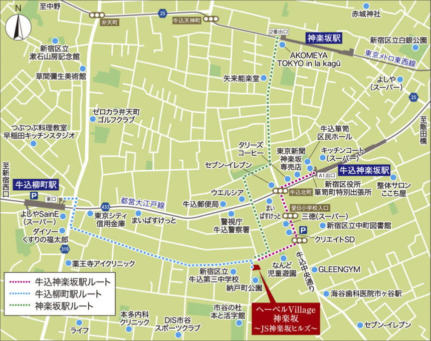 都営大江戸線 牛込神楽坂駅より徒歩7分、牛込柳町駅より徒歩9分、東京メトロ東西線 神楽坂駅より徒歩11分