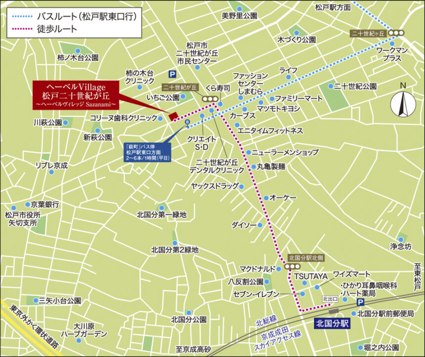 京成成田スカイアクセス線・北総鉄道北総線 北国分駅より徒歩15分、松戸駅東口方面 萩町 バス停より徒歩2分+松戸駅東口 バス停 乗車18分