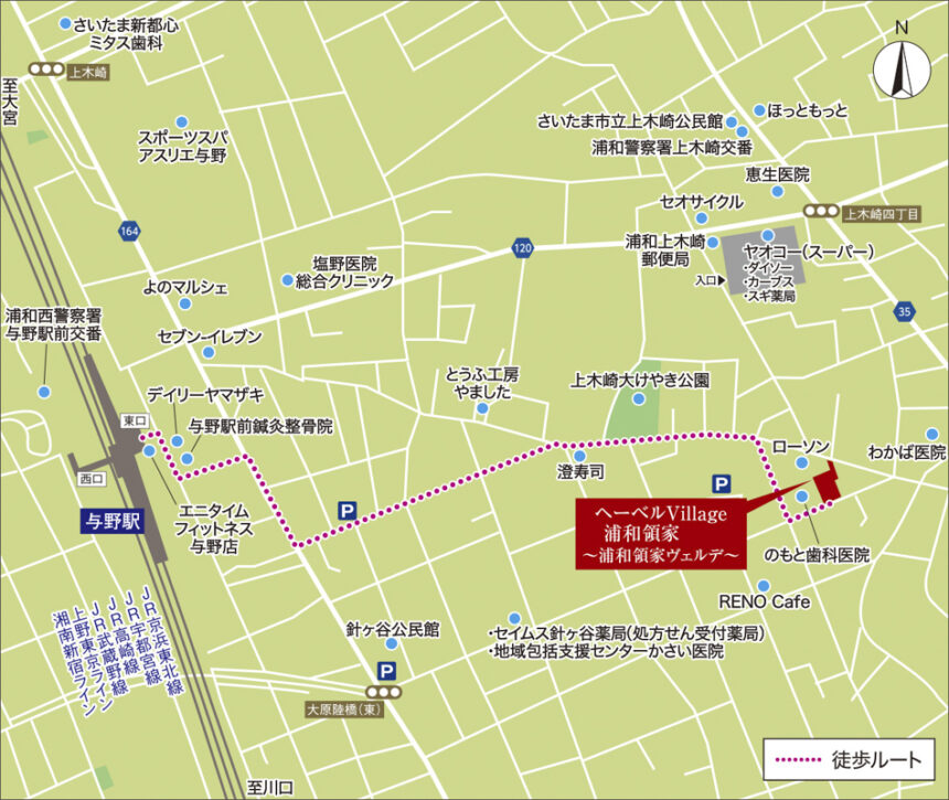 JR京浜東北線「与野」駅より ・大宮駅迄直通4分|JR京浜東北・根岸線快速利用 ・浦和駅迄直通5分|JR京浜東北・根岸線快速利用 ・新宿駅迄34分|JR京浜東北・根岸線快速利用、浦和駅でJR湘南新宿ライン特別快速に乗換え ・東京駅迄直通41分|JR京浜東北・根岸線快速利用 ※表示の分数は日中平常時のもので時間帯により異なります。また、乗り換え・待ち時間を含みます。